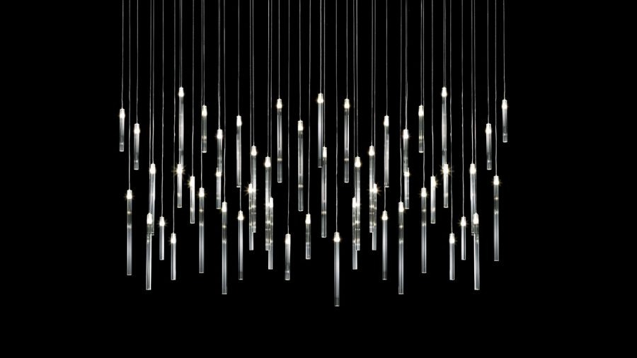 Lamp with ceiling plate in mirror glass with built-in LED. Pendant elements in solid transparent glass with LED.