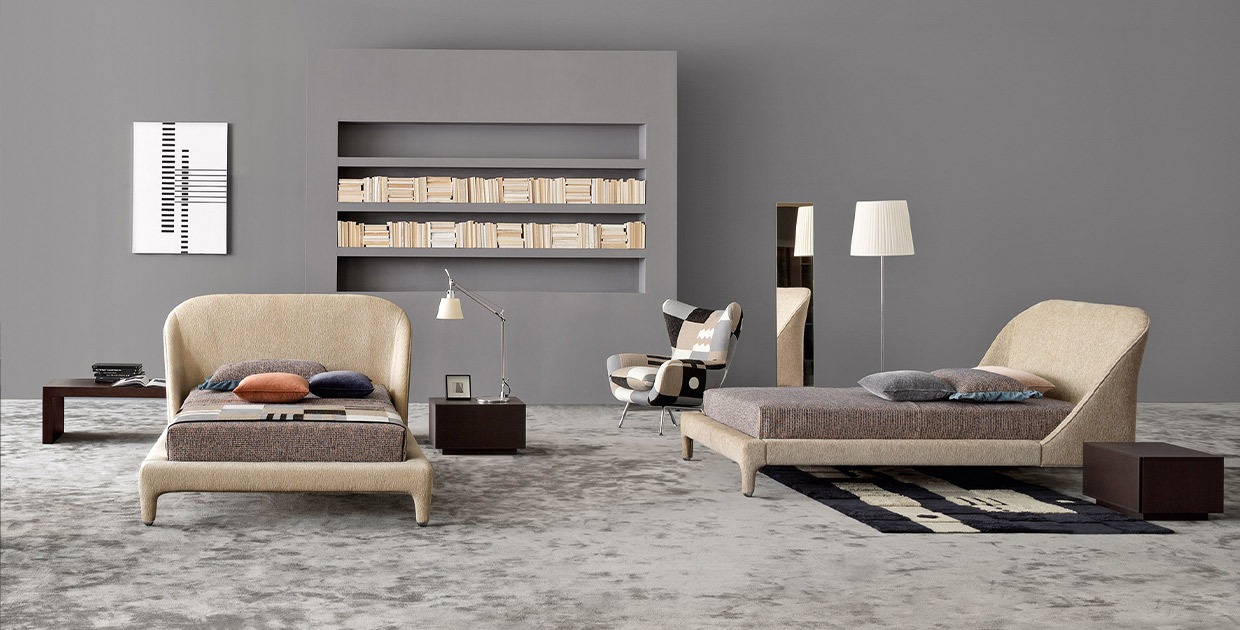 Delta is a double bed with contemporary lines, made with a rounded padded headboard. A strong expression of high tailoring thanks to coverings and stitching made with the utmost care in all its details. A bed that contains all the art of know-how of Italian artisans and weavers.