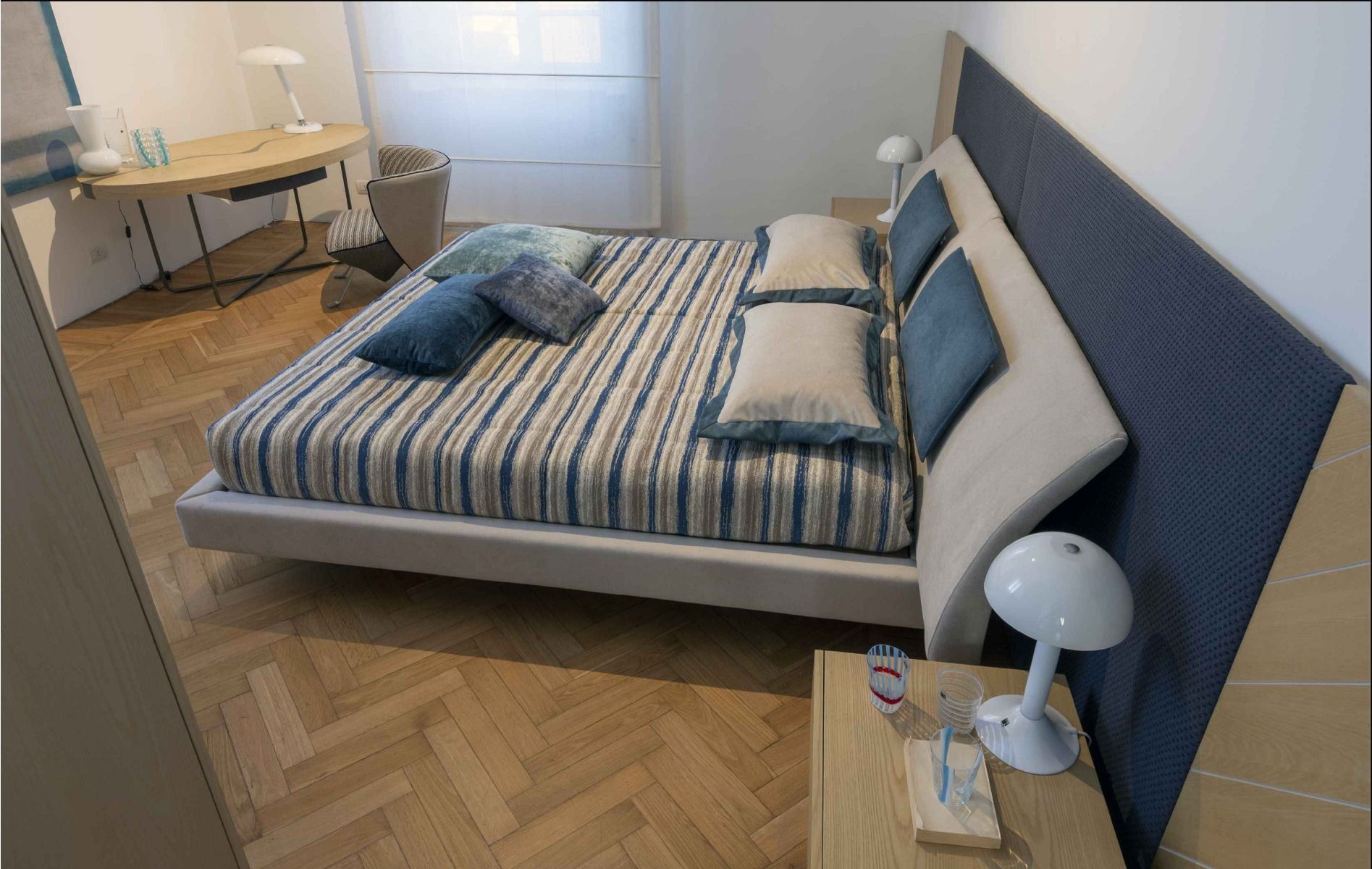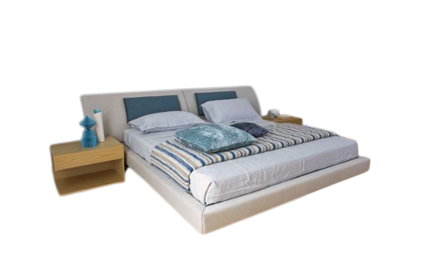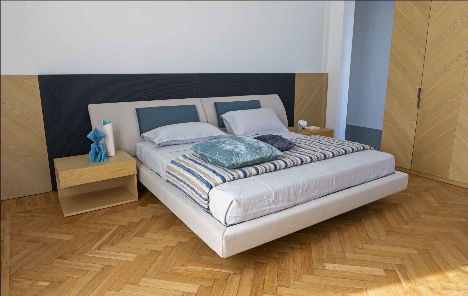 The Kim bed picks up the distinctive, elegant lines of the sofa that goes by the same name. These are particularly evident on the headboard and bed frame. The harmonious structure, covered with fabric, leather or mix upholstery, can be customised by one of two exclusive feet, available with or without an outer prop.
