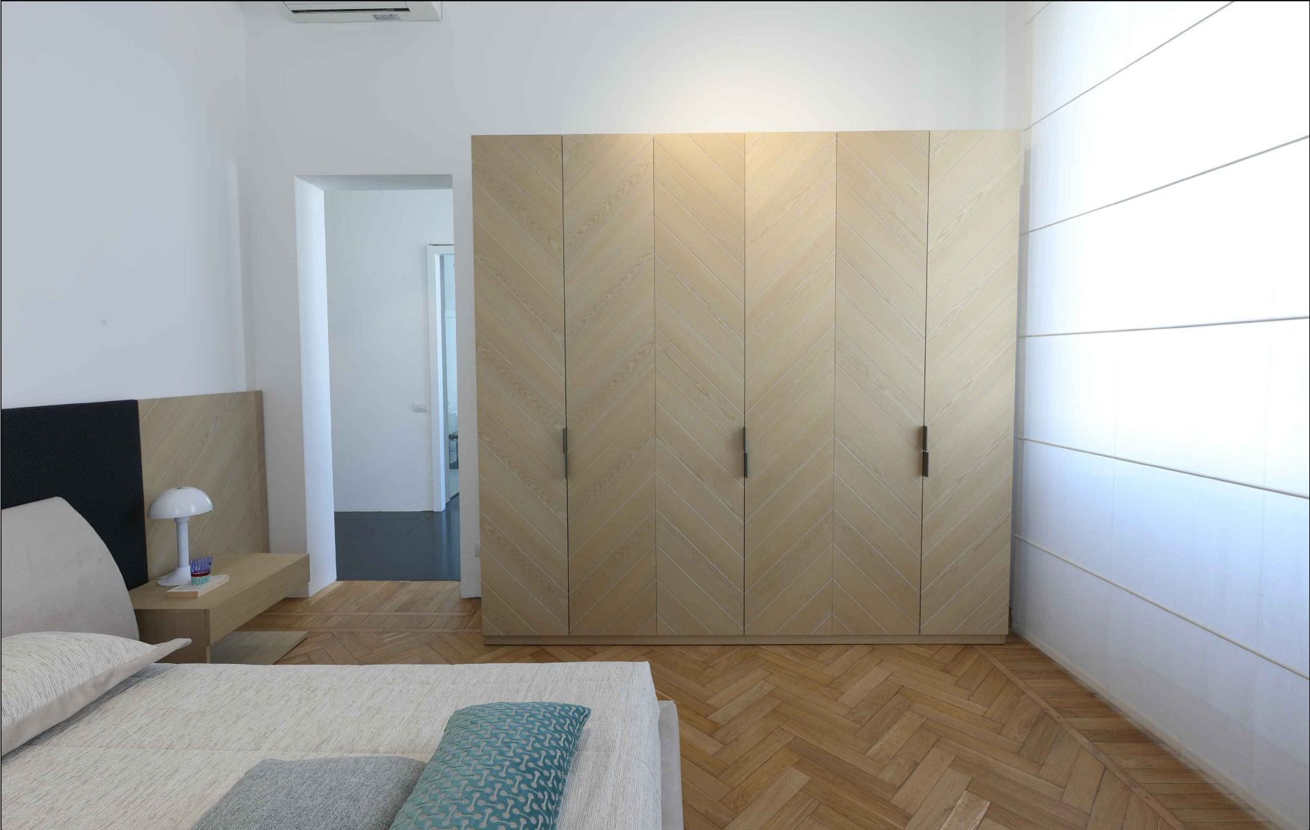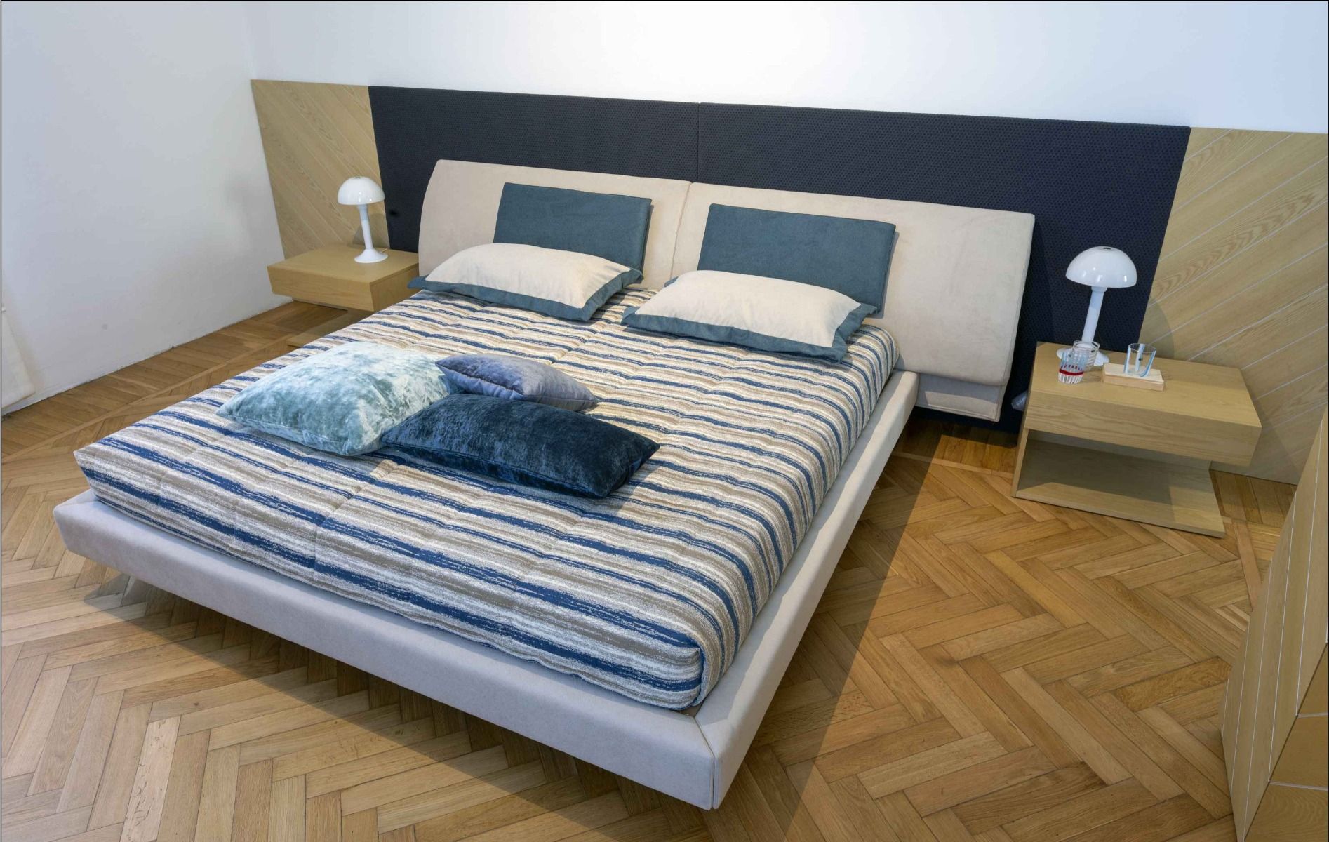 Upholstered bed with a long or short headboard covered in materials from our collection.