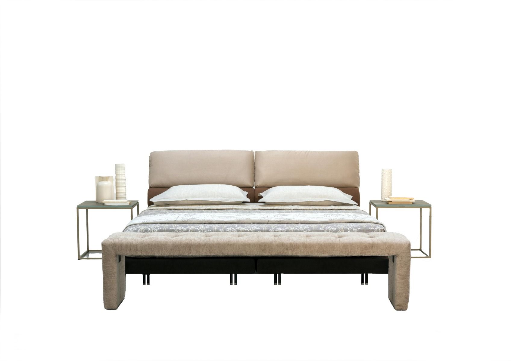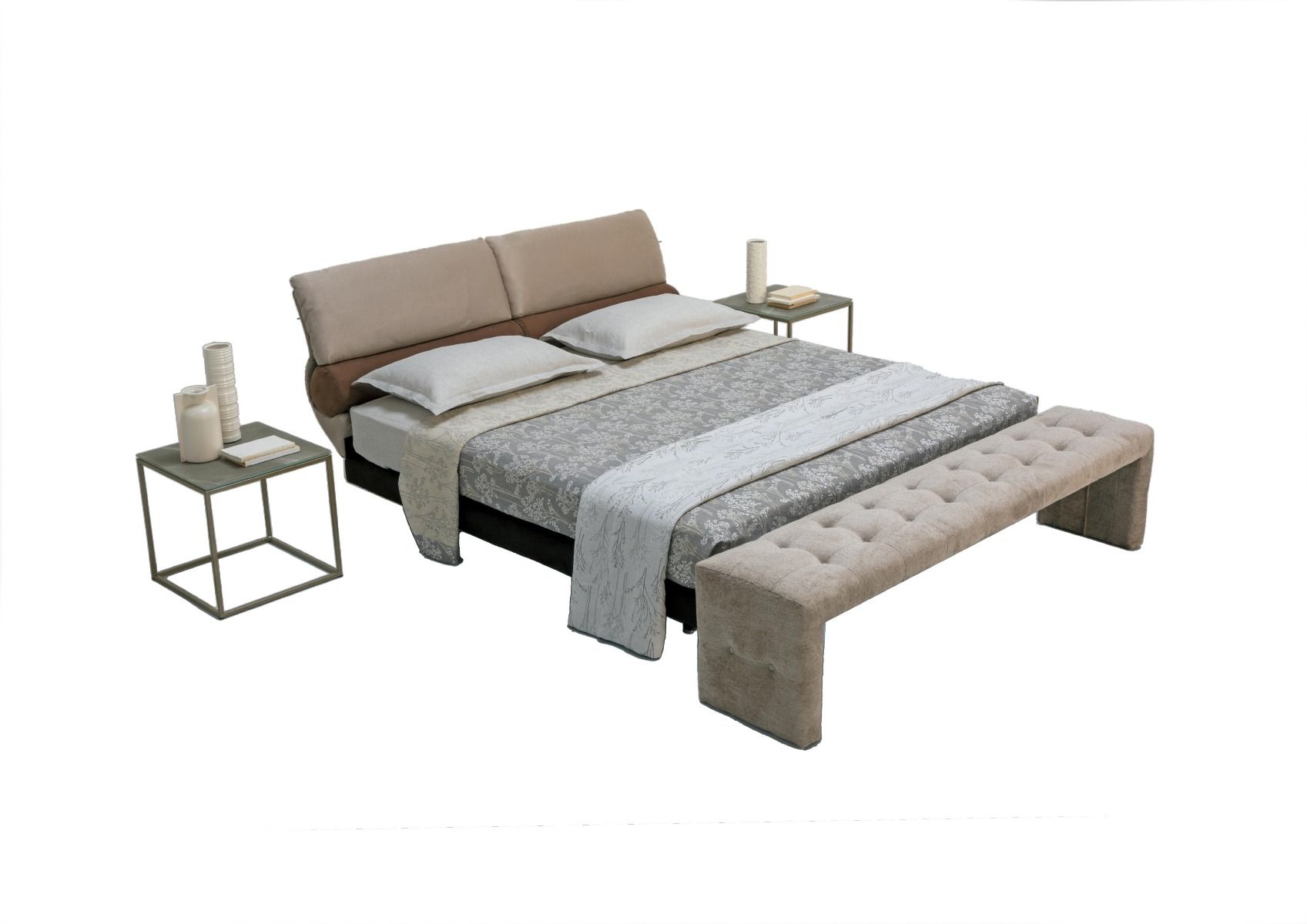 A long and soft roll with cushions on top make up the soft and inclined backrest of the bed's box spring. It is all in a containment and support structure that envelops with a swollen curve and supports with supple momentum.