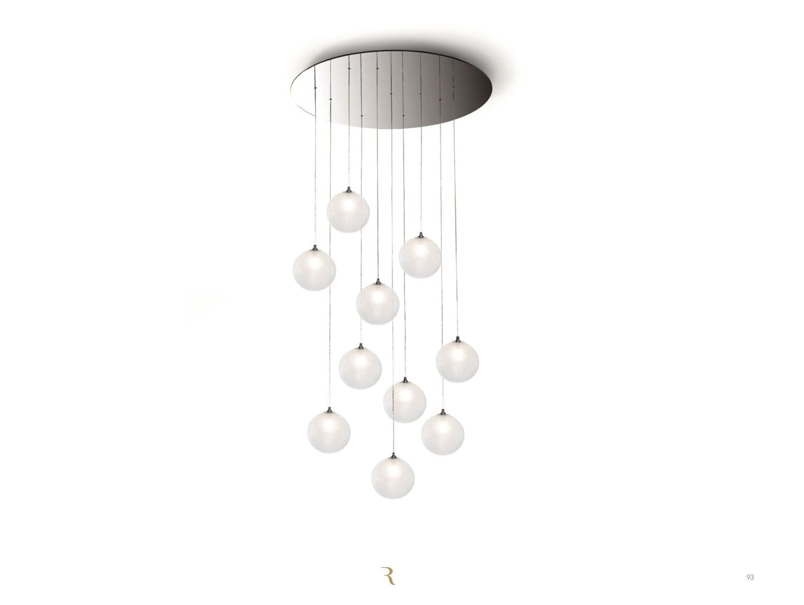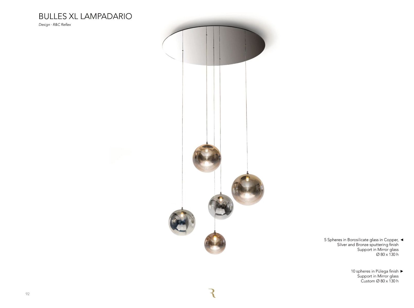 Chandelier with support in white or black lacquered or mirror glass and pendant spheres in blown borosilicate glass in 'light filter' finish bronze, gold, silver or copper with LED. It is possible to realize customized versions for dimensions, length and shape.