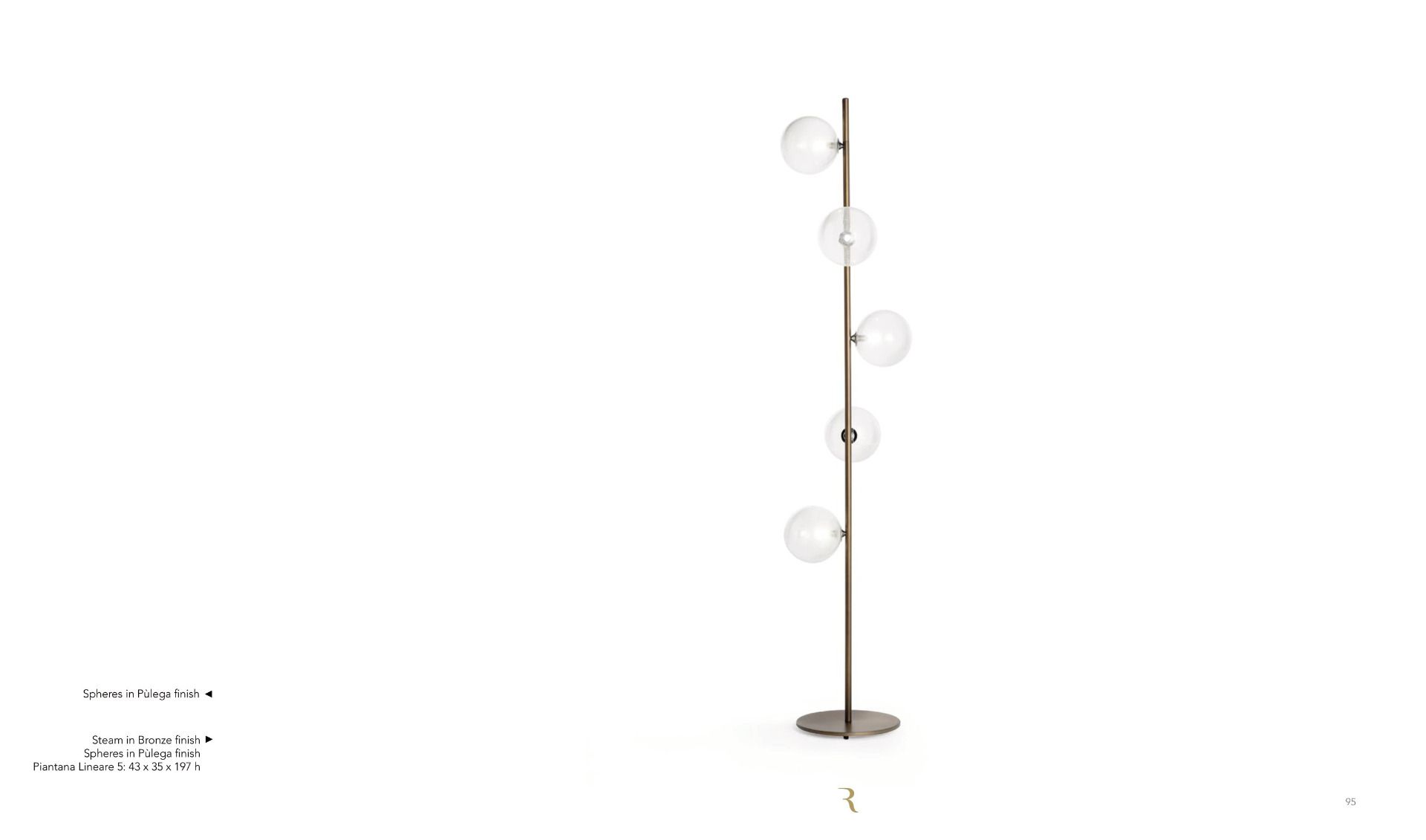 Floor lamp with metal structure in satin finish brass or dark titanium with adjustable inclination. Details in brass. 'Light filter' spheres in borosilicate glass: 1 x Ø16 cm in silver - 2 x Ø20 cm in gold and bronze. LED lighting.