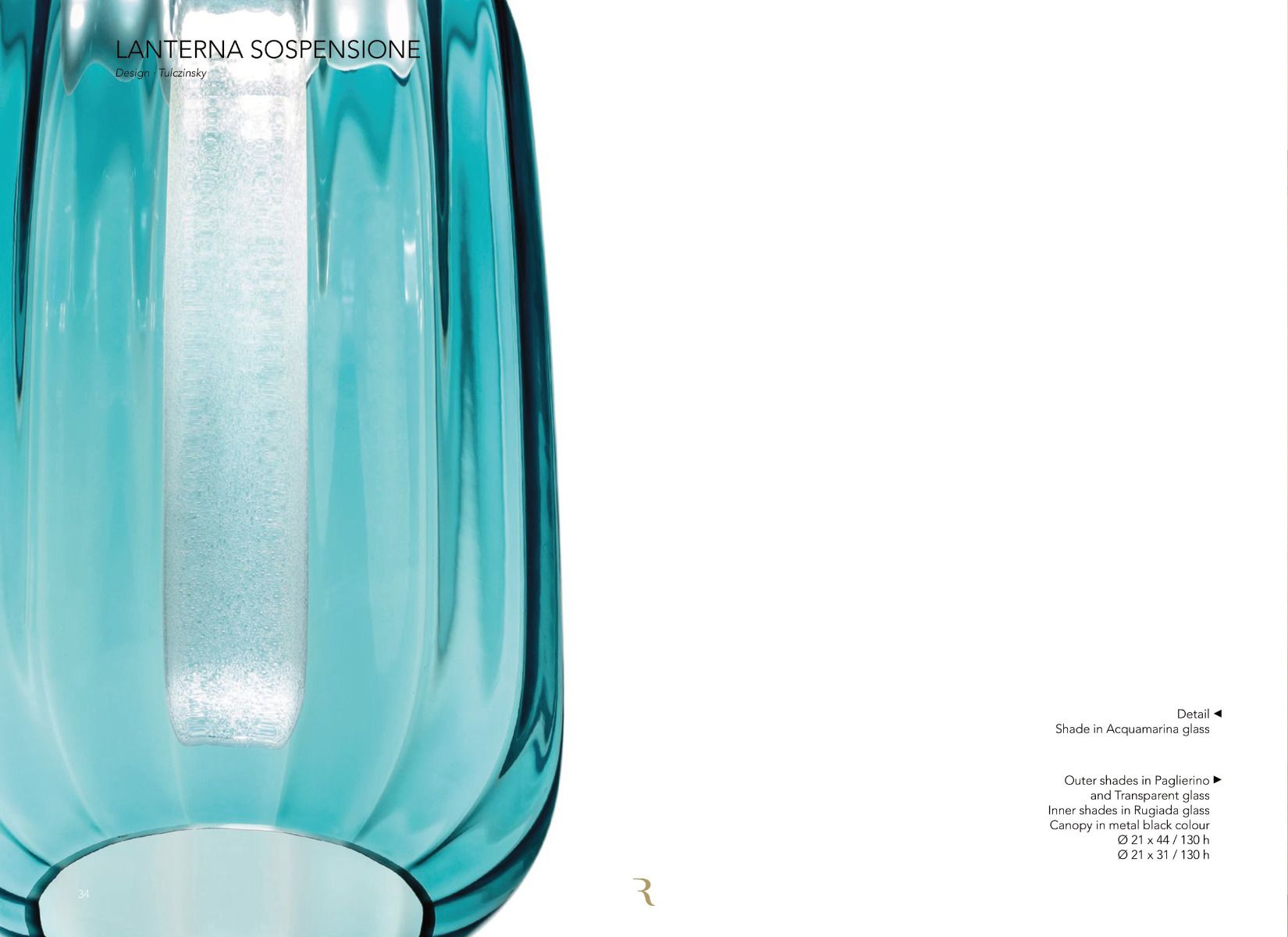 Sospensione in vetro artistico nei colori: trasparente, acquamarina, paglierino. Diffusore interno in vetro finitura Rugiada. Supporto in metallo cromato lucido e rosone in metallo e vetro verniciati nero. Impianto luce LED.