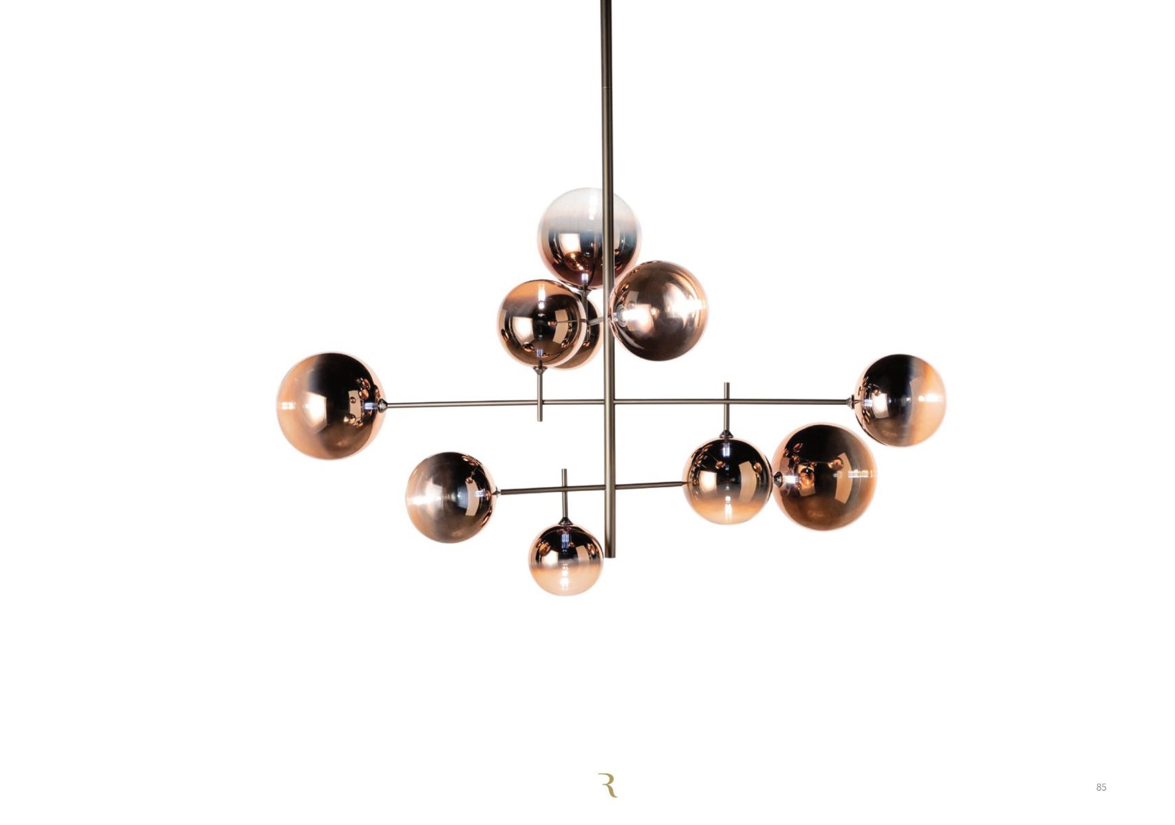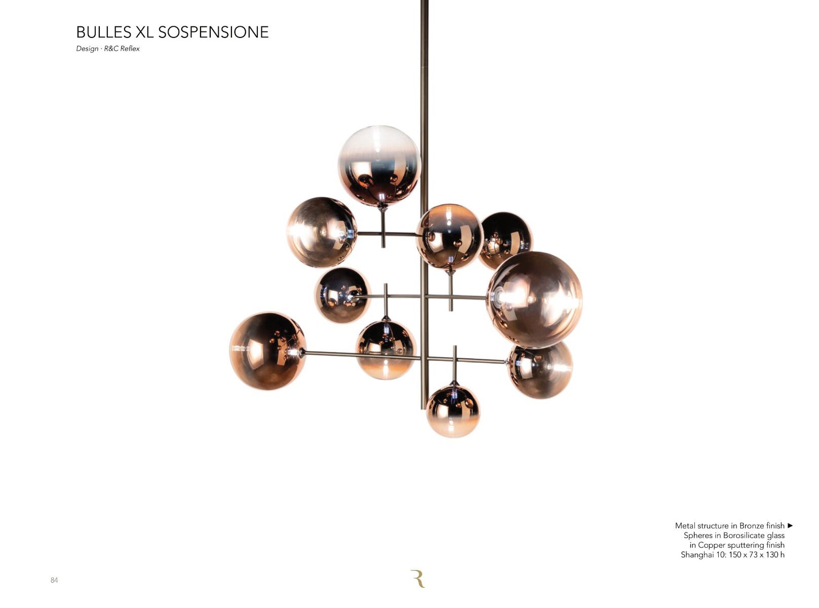 Reflex - Bulles XL Suspension Lamp Shanghai is made up of a metal structure in a bronze finish and spheres in transparent borosilicate glass or in the sputterig finishes in gold, silver, copper or bronze. This chandelier is available in two versions: one with six spheres and the other, larger, with ten spheres.