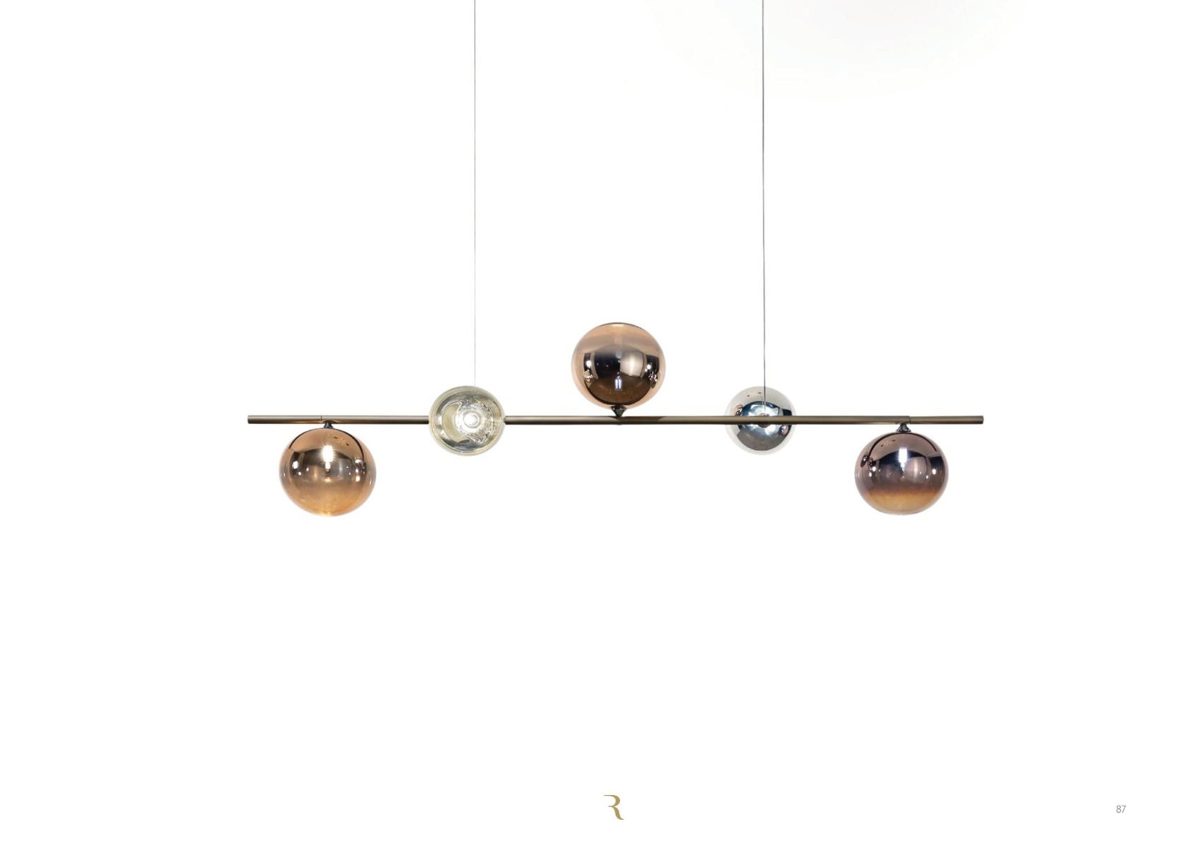 Suspension lamps that complete the Bulles XL collection. Metal structure in satin finish brass or dark titanium. 'Light filter' spheres in borosilicate glass in 3 different sizes in bronze, silver, gold or copper finish with LED