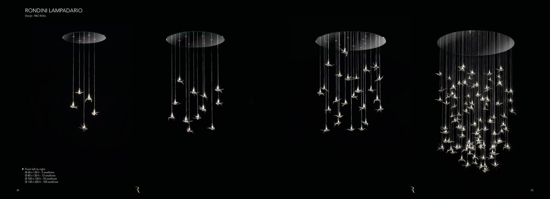Chandelier with black, white or mirror glass support and pendant swallows in transparent and black Murano glass with internal Led. It is available in various dimensions and shapes and can be customized for length and number of elements.