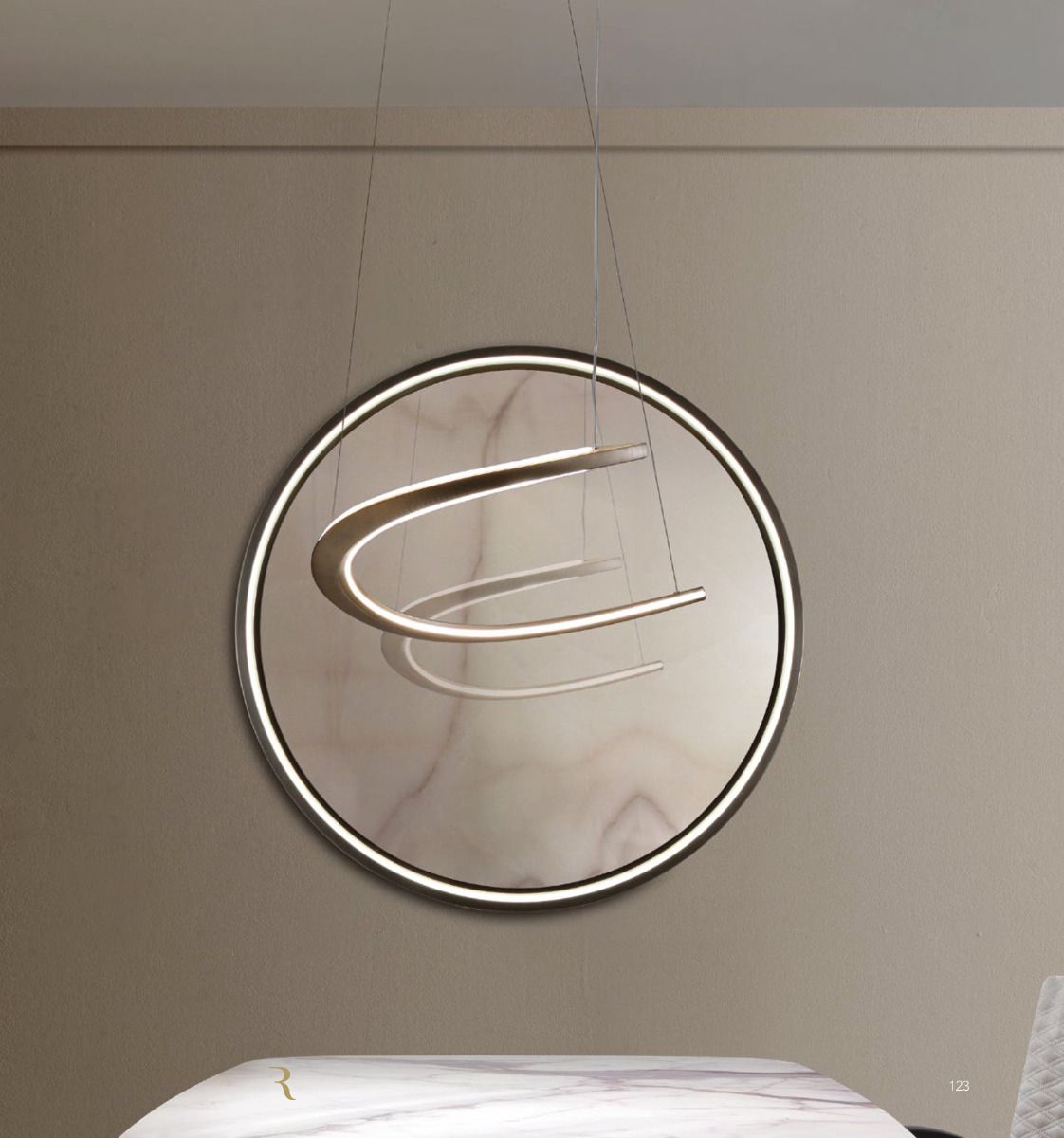 Lamp with oval mirror glass support with built-in LED and closing frame. 2 pendant curved elements in satin finish: brass, dark brass, titanium, dark titanium, with LED strip.