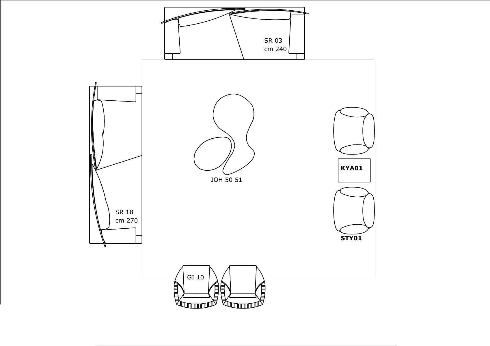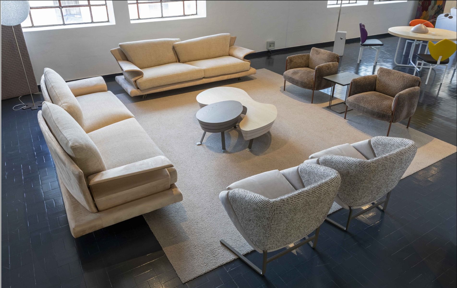 Compositions and sizes on request. Metal structure padded with non-deformable urethane rubber. Curved overlapping backrests, with two different depths for different seating comfort. The diagonal cut of the seat cushions connects with the particular shape of the back cushions.