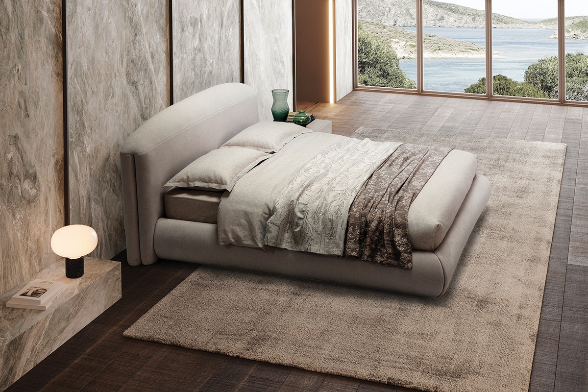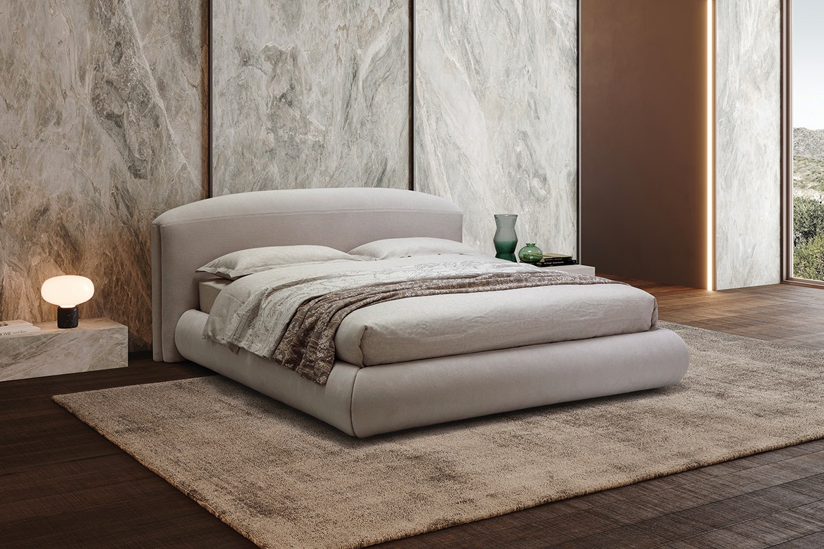 Softness, generous volumes, roundness. The headboard provides a comfortable support, and is softened by a large arch that ends on the side shoulders to define vertical lines as protagonists as a balanced play of volumes. The bed frame, in its fullness, expresses comfort, solidity, versatility for a welcoming and elegant feeling. With a contemporary line, freestanding or wall-mounted, gentle, feminine and refined.