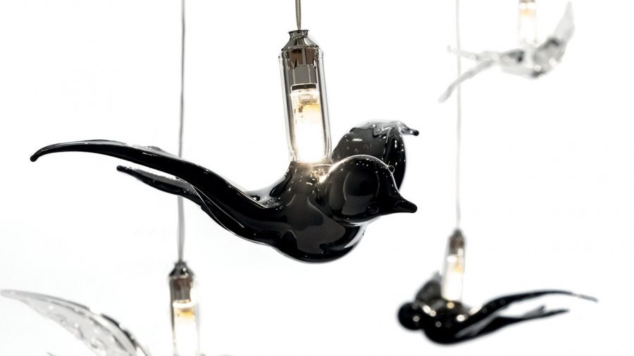 RONDINI LAMPADARIO, BLACK AND WHITE MURANO GLASS CHANDLEIER WITH PENDENT SWALLOWS