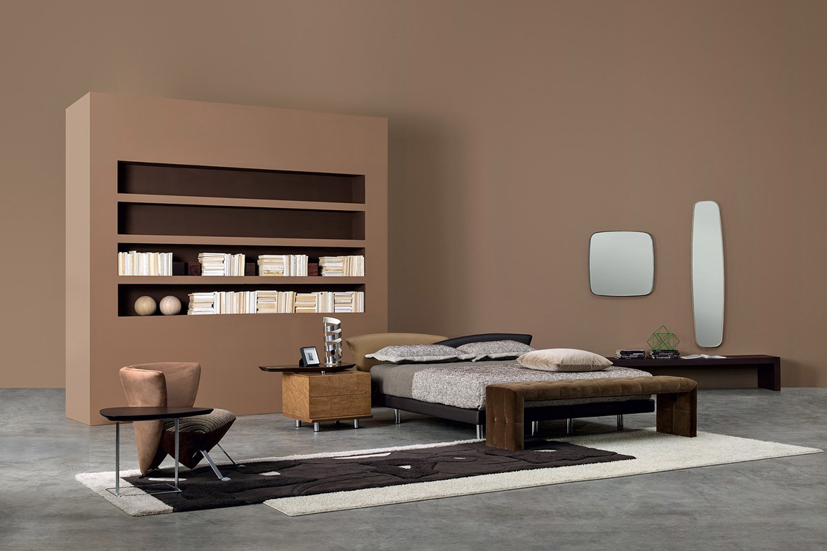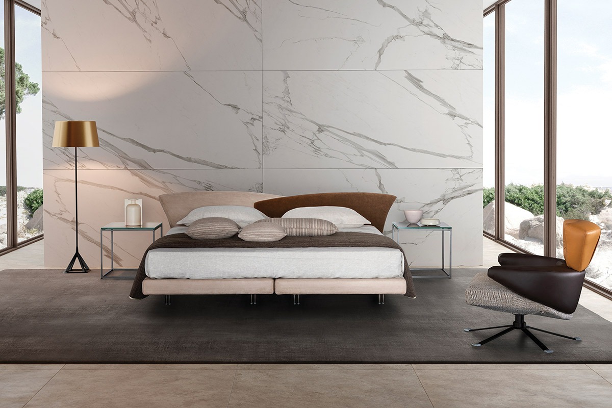 Bed with single boxsprings with metal structure padded with non-deformable urethane rubber. The headboard is composed of two overlapping curvilinear elements. The production is foreseen in the fabrics and leathers of our collection. It is possible to use the two asymmetrical elements as single beds. Posts in rigid quilted Alcantara are available upon request.